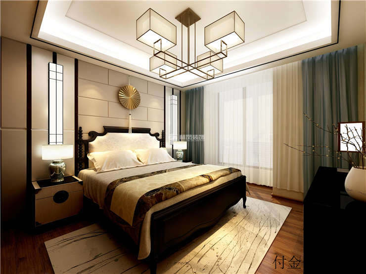 新中式的臥室的床是實木床,床品也是東方古典元素的錦緞。整個臥室的燈具、窗簾、地毯選擇的都是很現(xiàn)代時尚的。床的背景加上中式線條的點綴,整個客廳空間是東方傳統(tǒng)美學與西式新審美的碰撞融合。