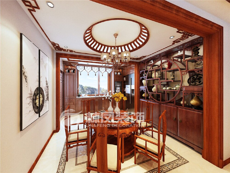 餐廳這部分,中式餐廳還是以實木裝飾為主。實木餐桌旁加了一個很大的博古架,既可以擺放花瓶裝飾,還可以儲物。
