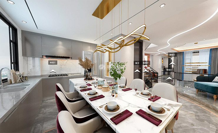 開(kāi)放式的廚房和島臺(tái)做了一個(gè)連接,大理石臺(tái)面與餐吊酒柜搭配,讓空間非常的有質(zhì)感,通透明亮,簡(jiǎn)潔大氣!島臺(tái)可以是一個(gè)小吧臺(tái),上面的餐吊酒柜,回家休息是可以小酌一杯。開(kāi)放式廚房的好處非常明顯,整個(gè)房屋的空間感很足,非常的寬敞開(kāi)闊。