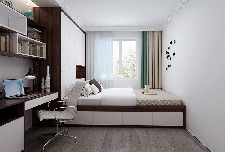 如果覺得收納柜+書桌的形式比較單調(diào),也可以取消大面積的書柜或者衣柜直接將桌面延伸到床尾當(dāng)成座位,躺在床上看劇非常的愜意。需要注意的是榻榻米下面的收納空間可以用來收納一些衣物或者日用品,但是在裝修是需要注意面板的承重能力。另外對(duì)于北方家庭而言,如果安裝地?zé)嵝枰⒁忾介矫紫路趴臻g的收納物品。