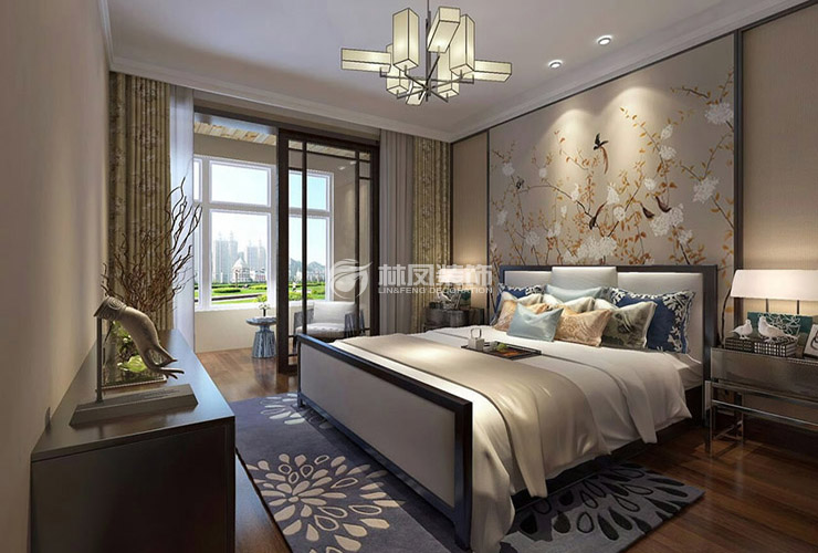 (圖為新中式風(fēng)格臥室陽(yáng)臺(tái)裝修效果圖)