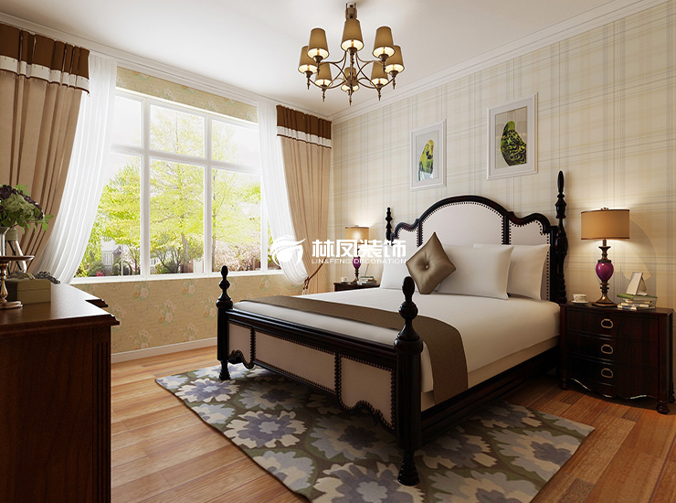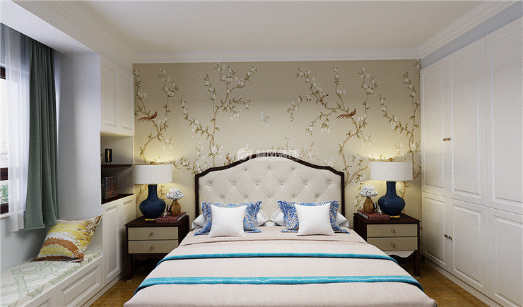 (圖為美式風(fēng)格臥室鋪貼壁紙裝修效果圖)