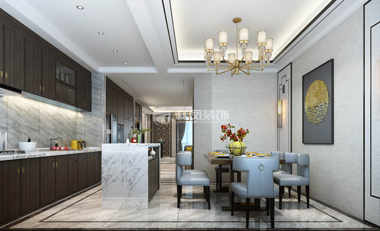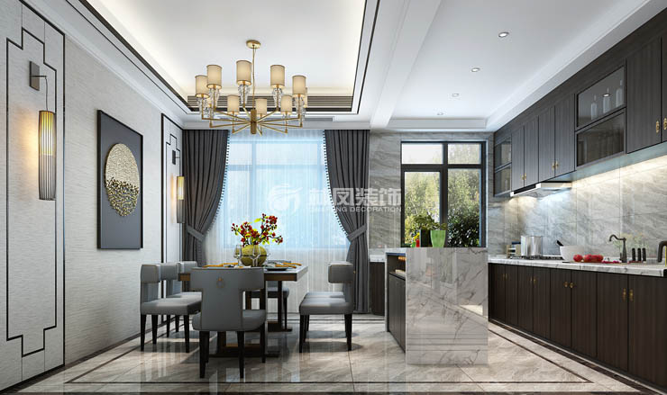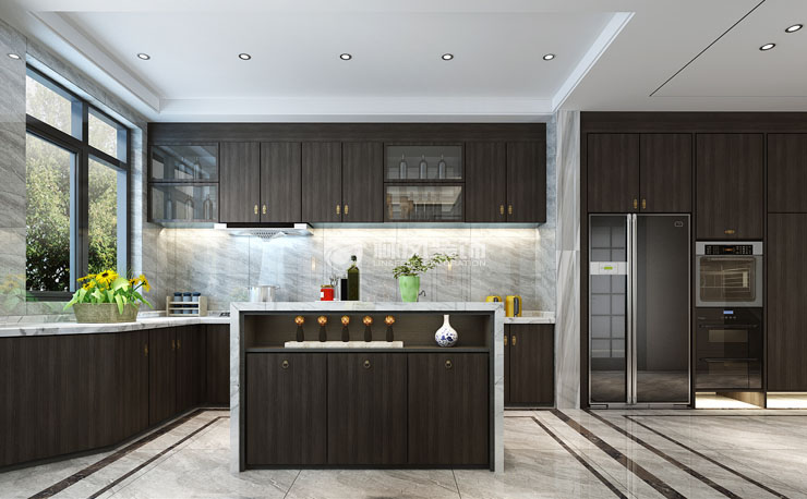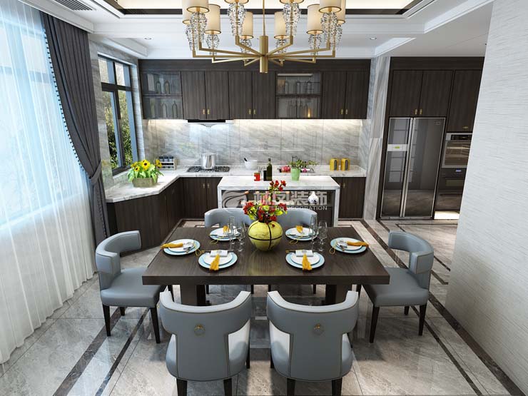 廚房通過土建改造后,為了與餐廳完美銜接,設(shè)計(jì)成敞開式廚房加西餐導(dǎo)臺(tái),不僅空間顯得更大,更通過黑胡桃色的櫥柜與白色櫥柜臺(tái)面的顏色層次感 來體現(xiàn)空間的完美結(jié)合。