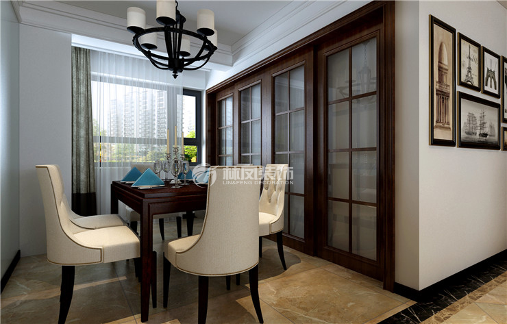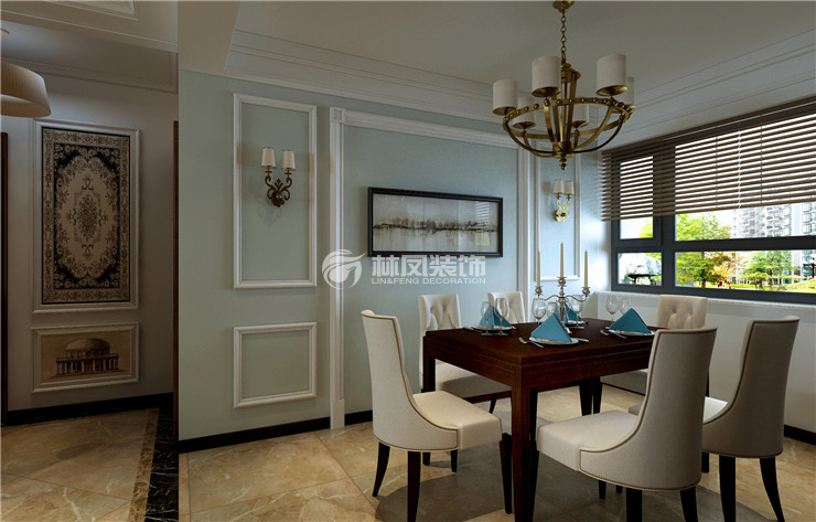 美式餐廳即西式餐廳風(fēng)格,渲染,體會(huì)異國餐飲情調(diào)為目的。實(shí)木餐桌和白色的墻體石膏線搭配顯示出來餐廳的感覺而不顯得老氣