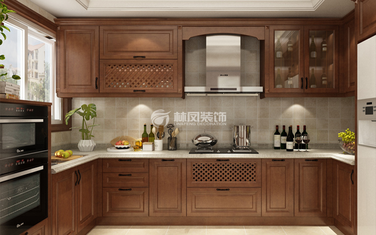 廚房主要以仿古墻磚在搭配實(shí)木門板,頗顯出自然風(fēng)姿,深淺搭配顏色的運(yùn)用,使整個(gè)空間更顯大氣。